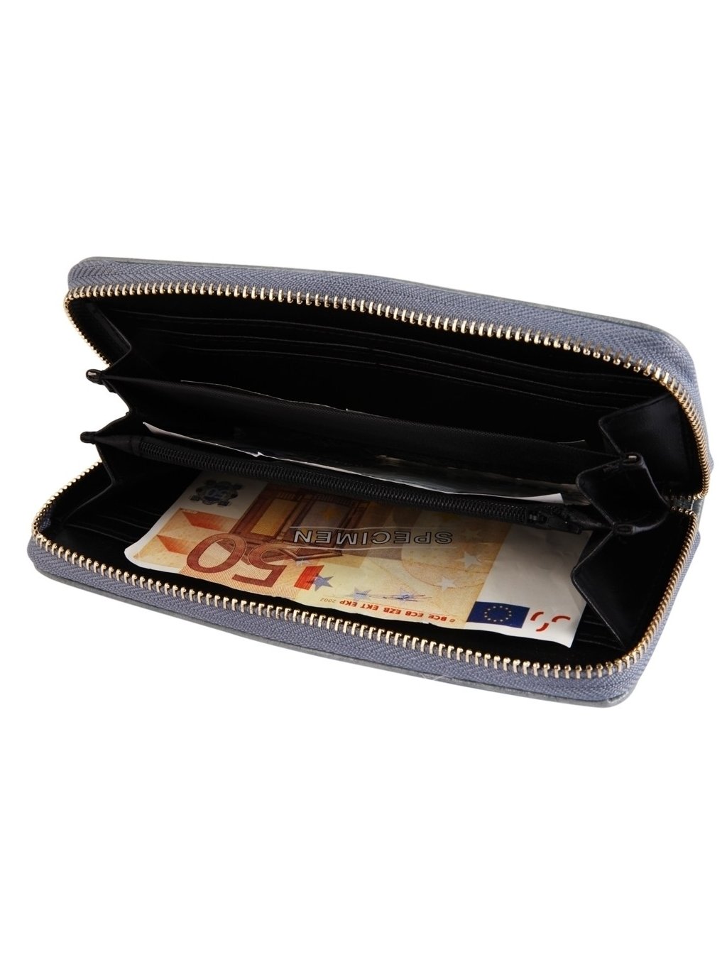 Peněženka je na šířku 19 cm široká a 10 cm vysoká. Má 3 přihrádky na bankovky, malou kapsičku na drobné a 8 kapsiček na kreditní karty.