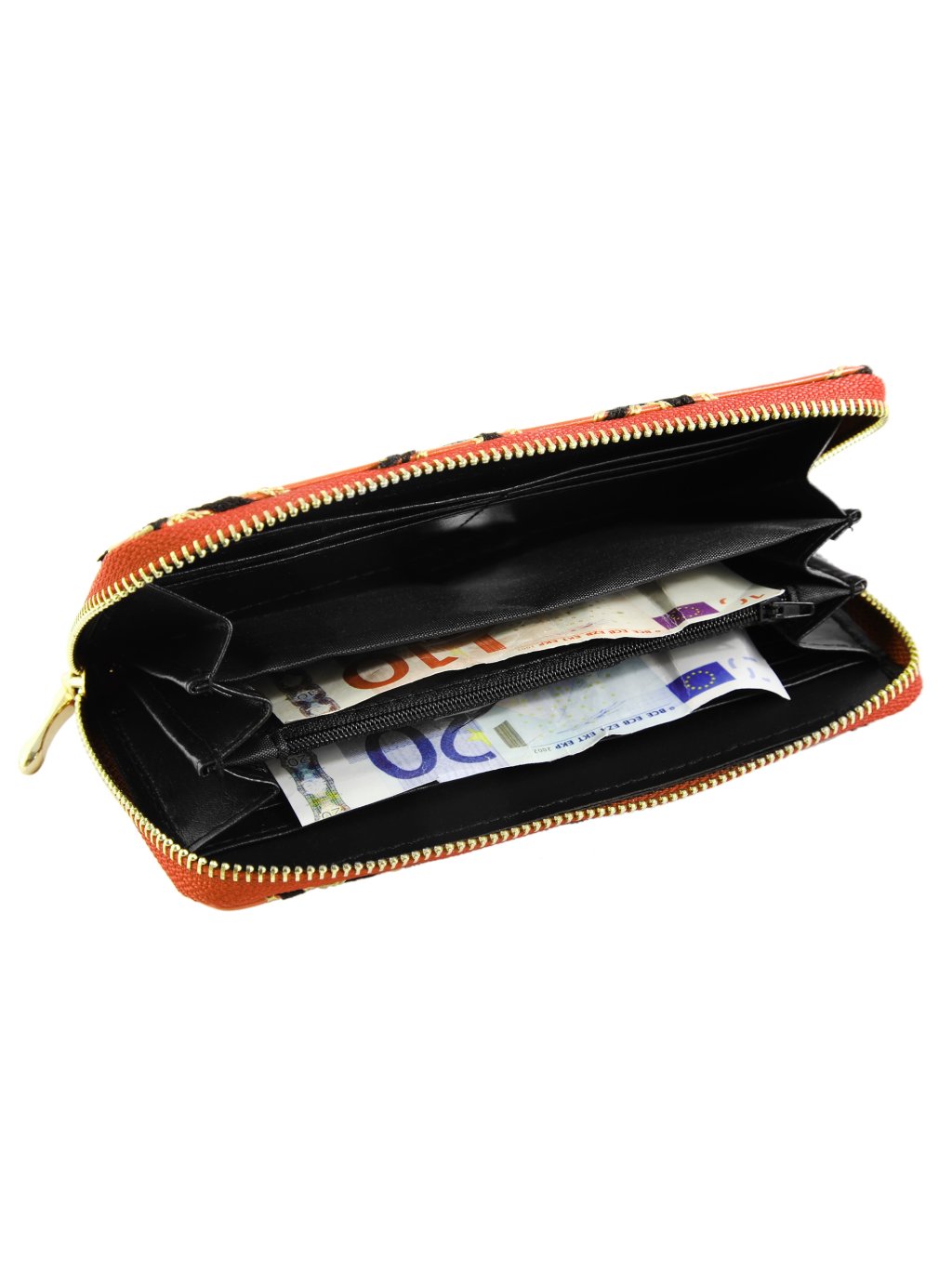 Šířka je u této peněženka 19 cm a výška 10 cm. Má kapsičku na mince se zavíráním na zip. Celá peněženka se také zavírá na zip zlaté barvy. Vyrobená je z imitace kůže a textilu. EKO kůže