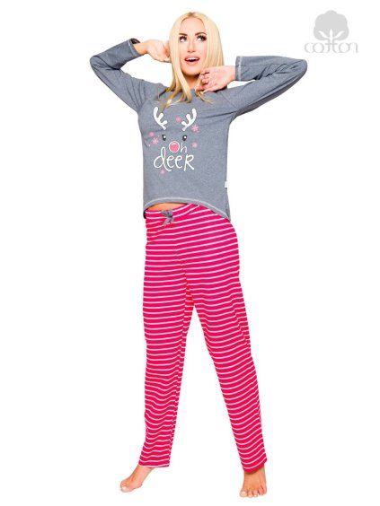 Dámské bavlněné pyžamo s dlouhým rukávem a vzorovanými kalhotami. Tričko je zdobené potiskem s barevným lemem okolo výstřihu a rukávů. Kalhoty jsou šité bez kapes a mají volnou gumu v pase. Možno použít i jako domácí oblek.Buďte první, kdo napíše příspěvek k této položce.