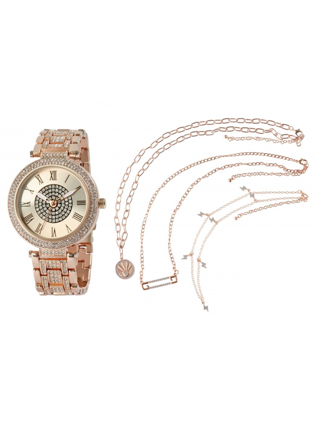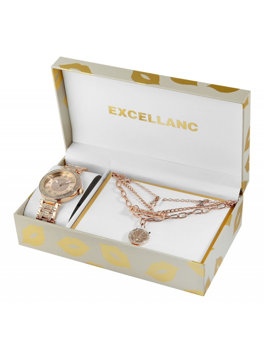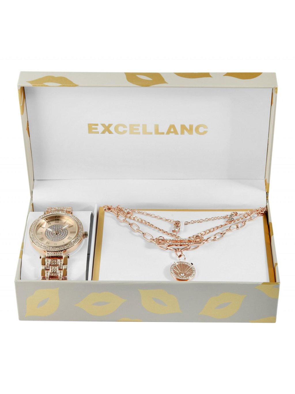 Dárková sada Excellanc s dámskými náramkovými hodinkami a třemi náhrdelníky barva růžového zlata