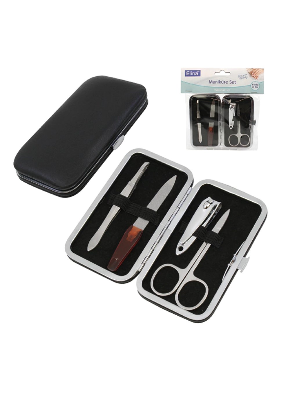 Základní manikůrní set se 4 nástroj z nerezové oceli. Vnější obal je vyroben z eko kůže a vnitřek v černém semišovém provedení. Skládá se z pinzety, pilníku, nůžek na nehty a zaoblených nůžtiček.Doplňkové parametry