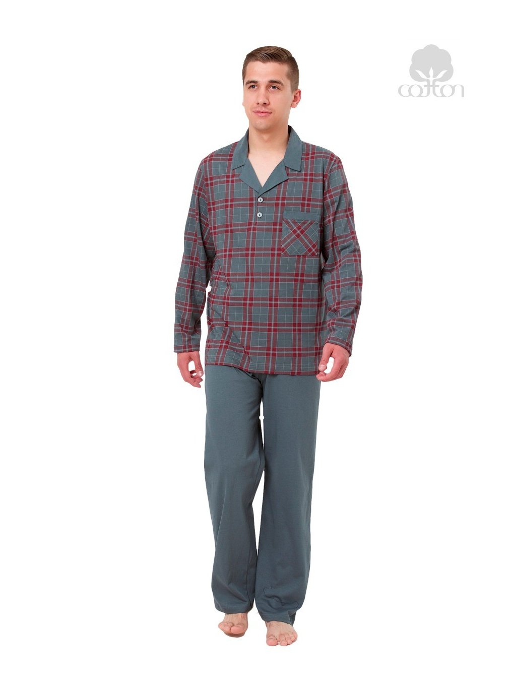 Pánské bavlněné pyžamo s dlouhým rukávem a kalhotami. Propínací kabátek s límečkem je ozdobený vzorem kostky a kapsičkou na prsou. Jednobarevné kalhoty jsou šity bez kapes a mají všitou gumu.Buďte první, kdo napíše příspěvek k této položce.